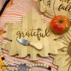 Maple leaf-shaped wooden shaped cheese board with word grateful embossed on the leaf is a perfect addition to your fall, harvest, and holiday table. This 2 piece food safe set is great for a charcuterie board. Can be used on a counter or table as a serving piece. Makes a great hostess, holiday, bridal, wedding, and housewarming gift. It is 11 x .6 x 11. Light natural brown and embossing is a darker brown.